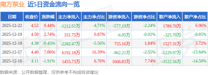 证券之星音讯,到2025年12月22日收盘,南边泵业(300145)报收于4.52元,上涨0.44%,换手率2.98%,成交量57.05万手,成交额2.57亿元。